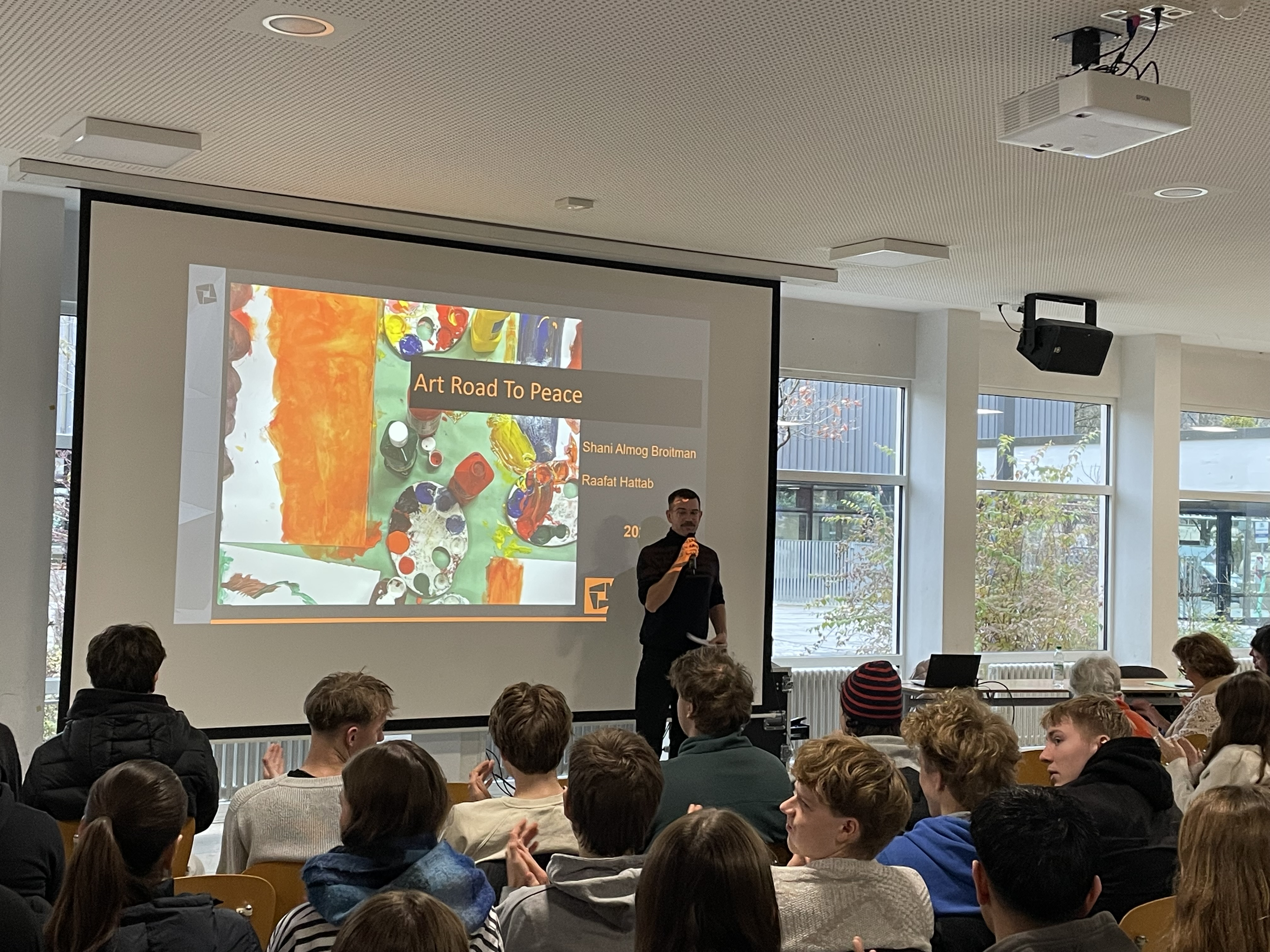 Die Frage nach Frieden im Nahen Osten beschäftigt uns wohl alle. So auch die Schüler*innen der Q13, die sich in ihren Geschichtskursen intensiv mit dem Nahostkonflikt befasst haben. Umso wertvoller war es daher, eine Perspektive direkt aus der Region zu hören. Aus diesem Grund bekam die Q13 des AWG am 25.11.2025 Besuch von zwei Mitarbeitenden des Tel Aviv Museum of Arts in Israel, die das Projekt „The Art Road to Peace“ vorstellten. Der Kontakt war über den Förderverein des Museums in Deutschland zustande gekommen – dessen Vorsitzende interessanterweise Mitglied des ersten Abiturjahrgangs am AWG war.